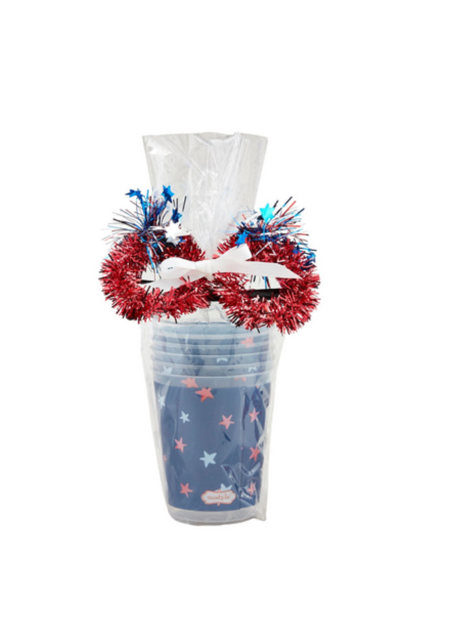 Elevate your next celebration with this vibrant 7-piece party set, designed to add a touch of fun and flair to any gathering. This set includes six colorful party cups, each with a generous 16 oz capacity, perfect for serving your favorite beverages, from refreshing iced teas to festive cocktails. The cups are crafted from durable plastic, ensuring they are both lightweight and sturdy, making them ideal for both indoor and outdoor events. Adding to the festive spirit, the set also features a pair of playful party glasses, measuring 3" x 6 1/2". These glasses are adorned with eye-catching tinsel accents, making them a delightful accessory for guests to wear and enjoy. The entire set comes beautifully wrapped in cello, making it a fantastic gift option for hosts or a convenient purchase for your own party needs.