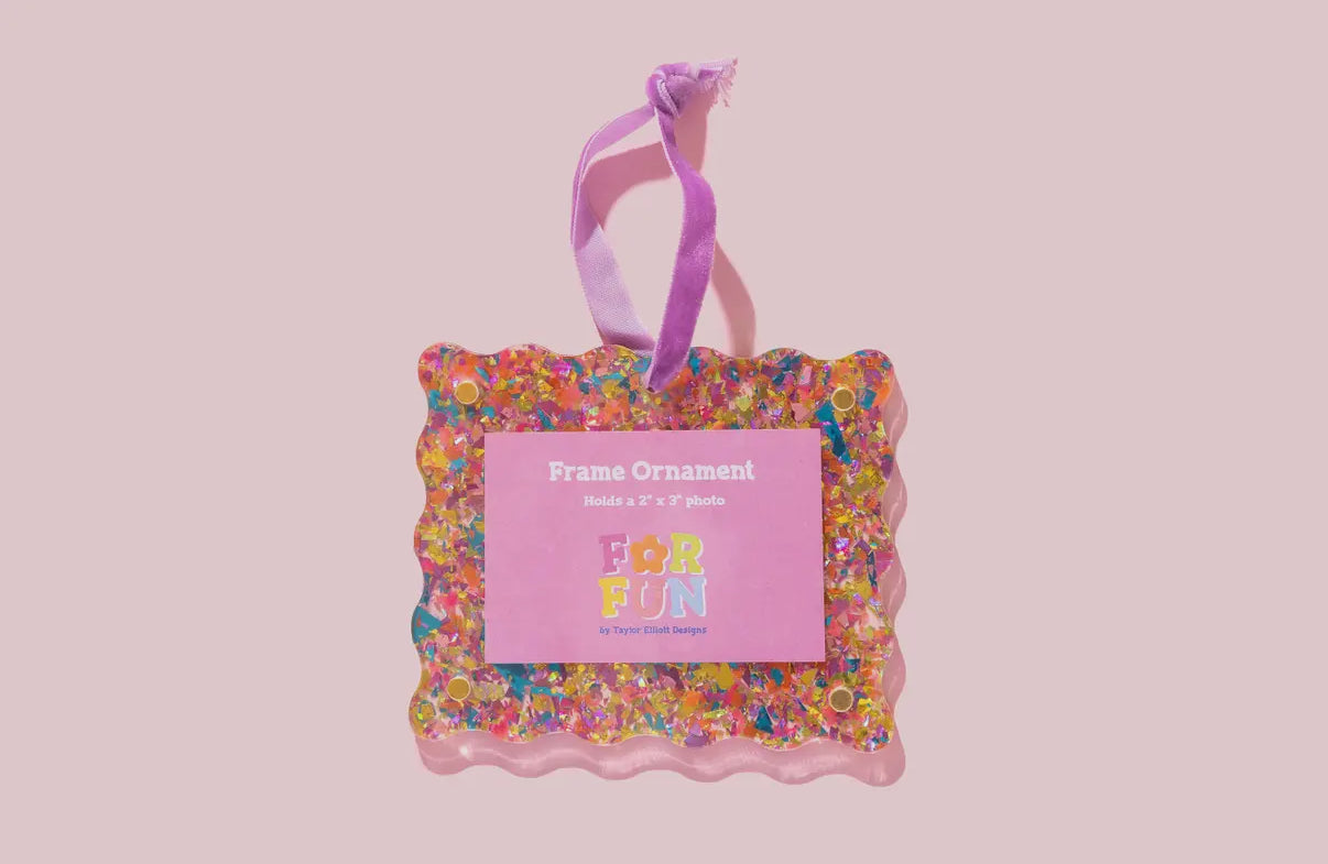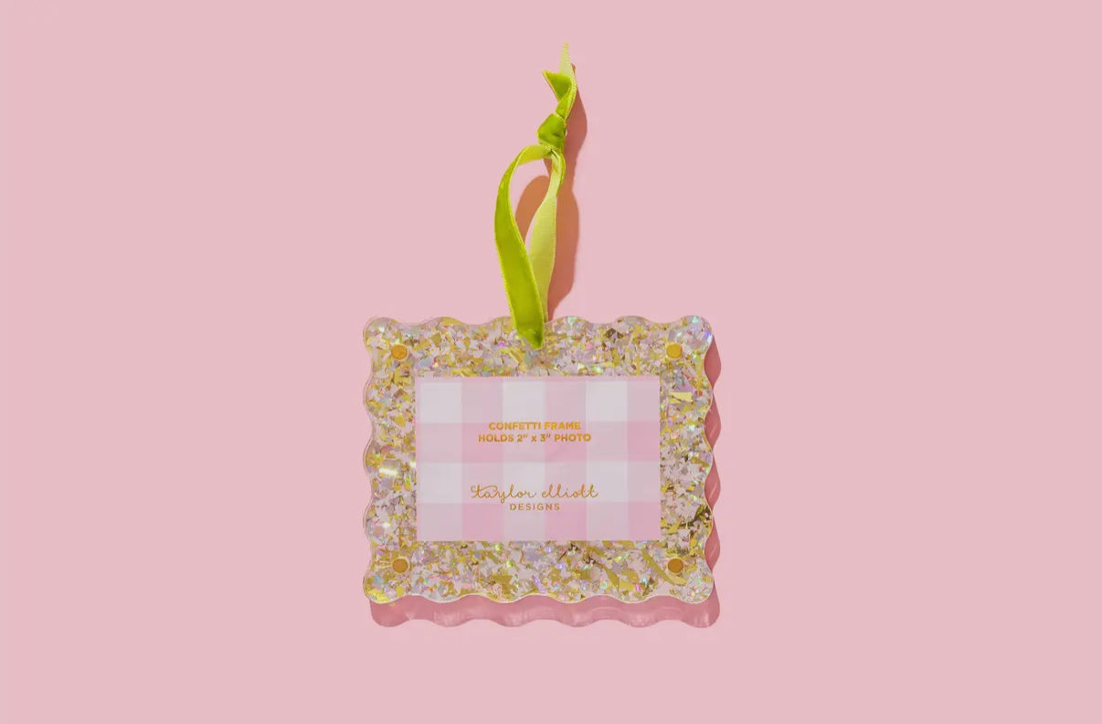 Confetti Frame Ornaments, designed to delight across holidays and everyday moments. Each ornament features a clear acrylic frame filled with hand-sprinkled confetti, a velvet ribbon hanger for easy Christmas tree trimming, and gold magnets in each corner to place a photo between front and back pieces and the frame will snap closed with magnets!