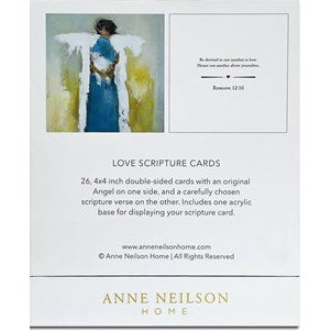 Love is an incredibly powerful word, used by many and understood by few. God's love letter to us breathes grace, peace and unconditional love. We have selected 26 of our favorite scriptures to remind us of this truth. Our curated scripture cards feature 26, 4x4 inch double-sided cards with an original Angel on one side, and a carefully chosen scripture verse on the other. Each set comes with one acrylic base for displaying a scripture card.
