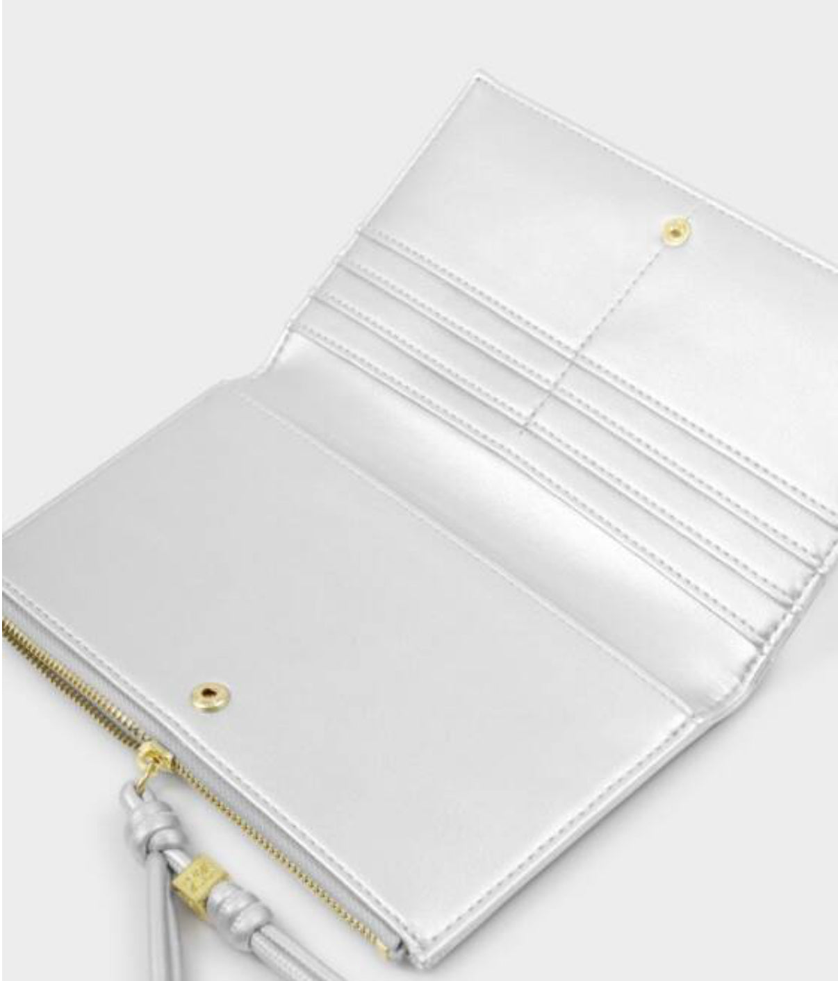 Our Arden Large Braided Wristlet Wallet in Silver showcases a detachable braided wristlet strap with gold-tone branded hardware for a luxe finish. Designed with a hidden magnetic closure, it opens to reveal six internal card slots and a wide slip pocket for notes and receipts, plus a top zip pocket to keep coins secure. Pair it with the matching Arden Mini Bag or Top Handle Bag for a perfectly coordinated look.