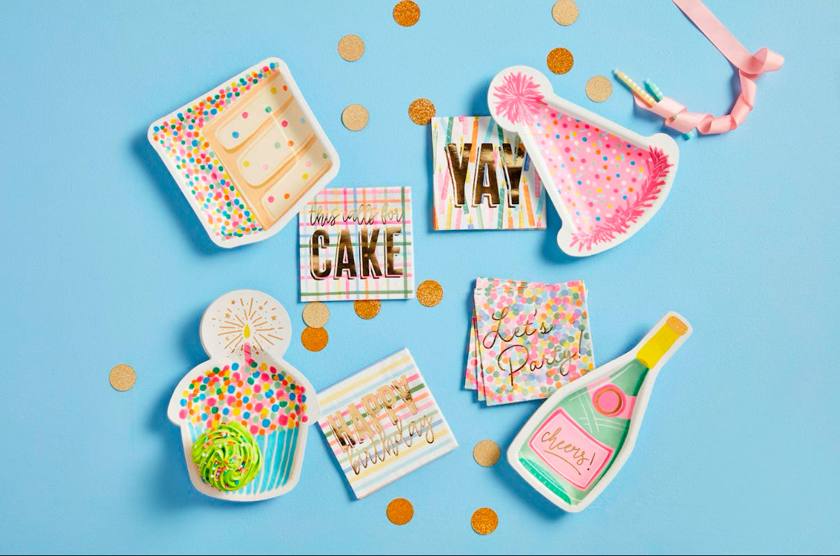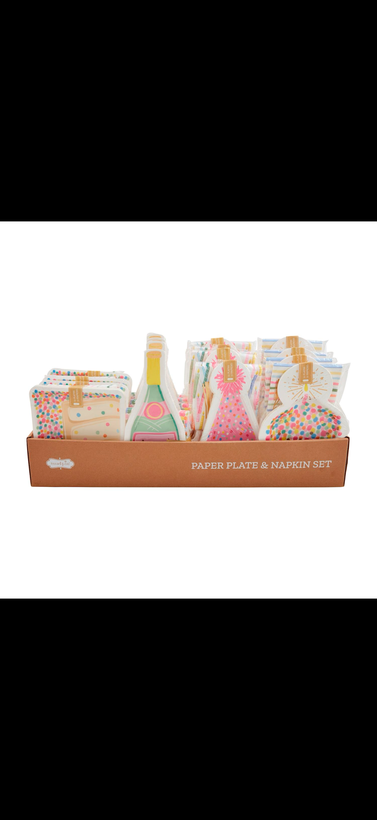 2-piece set. Pack of 12 figural paper plates come with pack of 12 paper cocktail napkins.