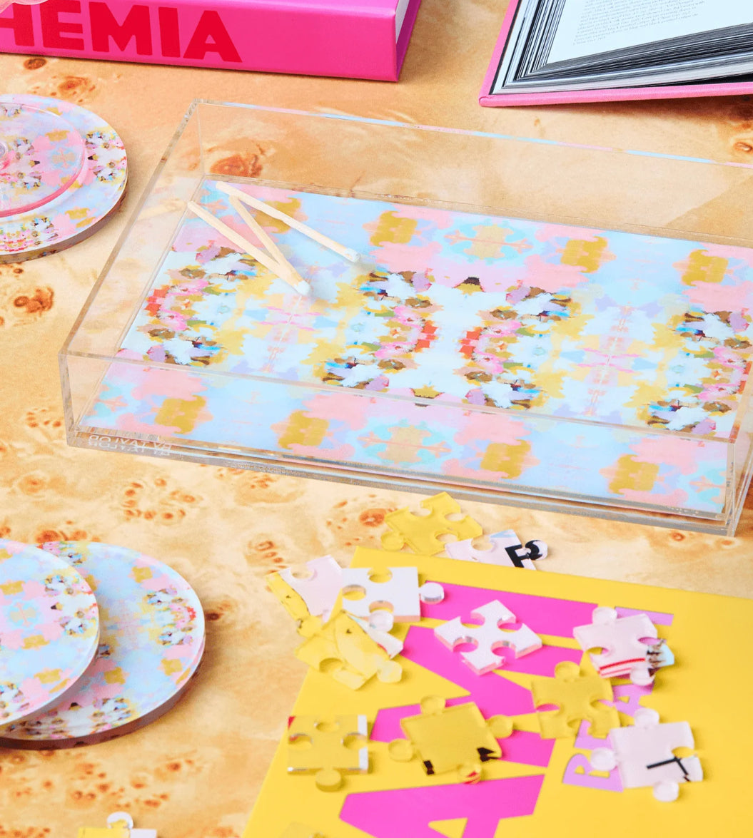The uses for this tray are endless - perfect to keep on your bathroom sink or nightstand, on your coffee table or office desk, as a serving or charcuterie tray and the list goes on! Each lucite tray features original Laura Park Designs x Tart By Taylor Collaboration artwork.