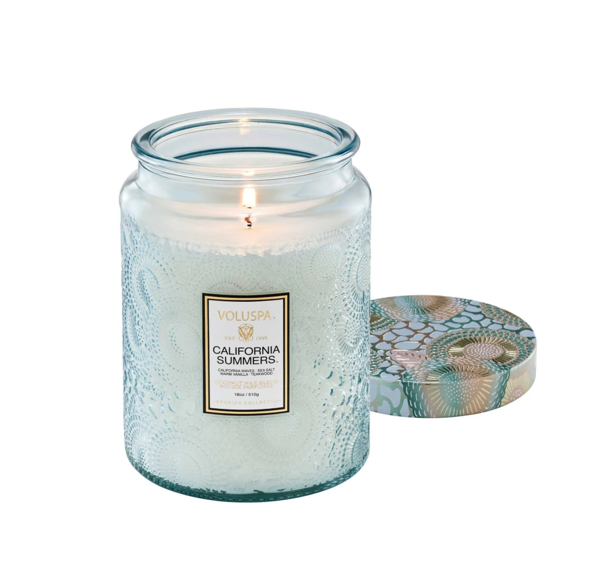 Plunge into the blue horizon and escape into another realm, where worries are reduced to coasting on hypnotic rolling waves. A salty ocean breeze tickles the skin as the sun reaches its peak height of the day, leaving you to bask in a teakwood sling chair, lathered in a tonic of warm vanilla and coconut milk. Welcome in the rising tides to wash away the cares of the day. Voluspa invites you to take the scenic route, so you may always return for California Summers.