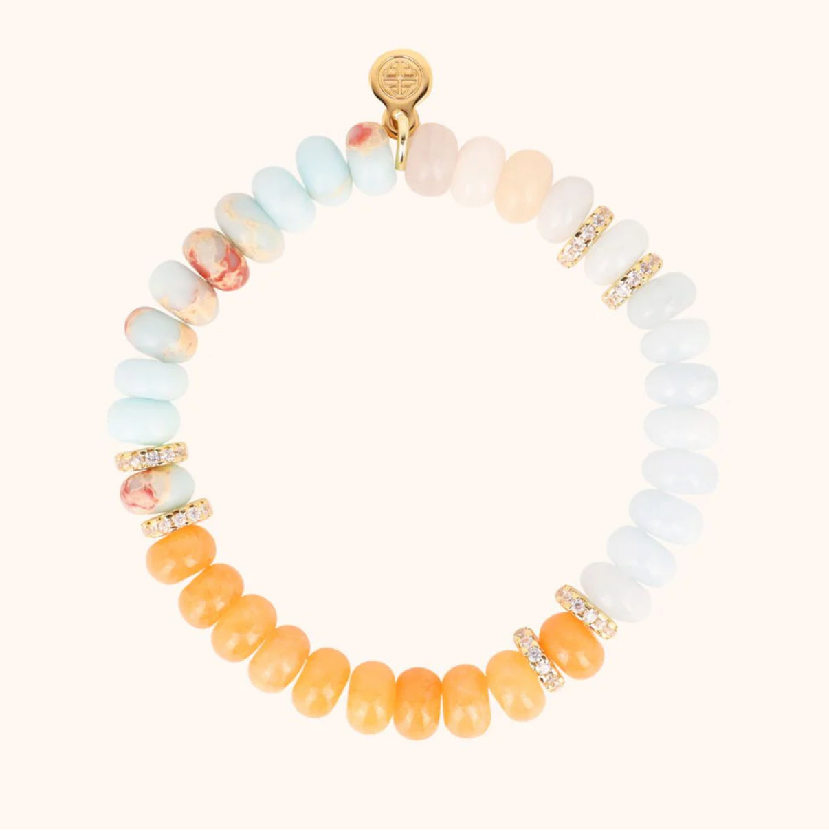 Our Bianca beaded bracelet, a classic Mala design, is adorned with a signature gold bead. Crafted from semi-precious stones, it's the perfect accessory for mindful living and effortless style.