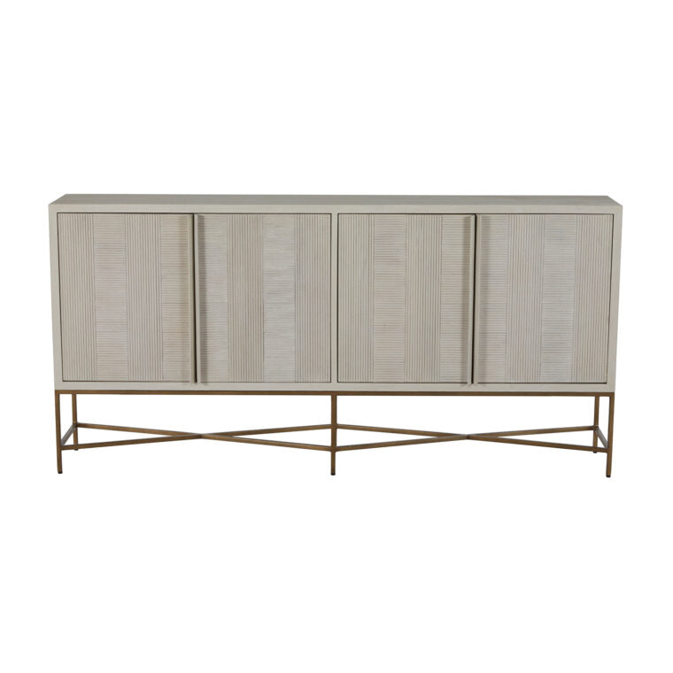 The slim silhouette of the Carol Sideboard makes it an easy fit in a variety of settings. Ribbing in a warp and weft-like pattern brings interesting texture to the cerused white sideboard. A stained brass X-design base adds a little glamour.