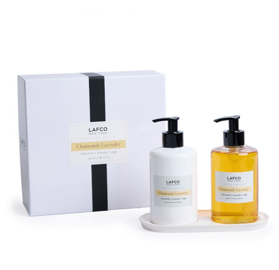 Perfect for the kitchen or bath. Our deluxe hand care set includes a liquid soap, hand cream, and ceramic tray that adds a simple, spa-like touch to any space. Calming chamomile melts into a heart of eucalyptus to create a feeling of well-being. Smoky patchouli is enhanced by hints of sage and rosemary for a quiet, relaxing finish.