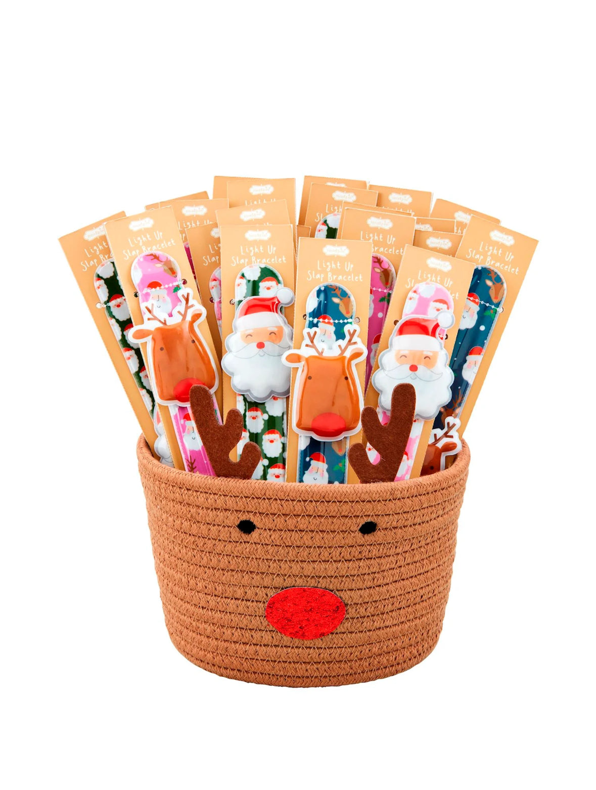 Select from 4 festive styles of kid-friendly light up Christmas slap bracelets. Each measures 8 1/2 inches by 1 1/4 inches and is made of durable plastic.