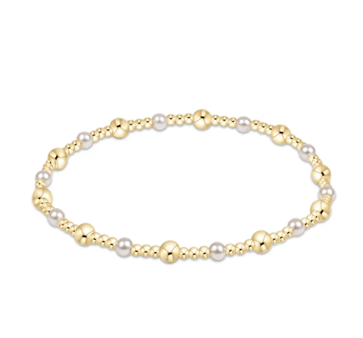 You will fall in love with this classic sincerity pattern 4mm bead bracelet with pearl! This bracelet is a classic gold beaded bracelet with alternating bead sizes. The larger bead size is a 4mm crystal pearl and the smaller bead size is a 2mm.