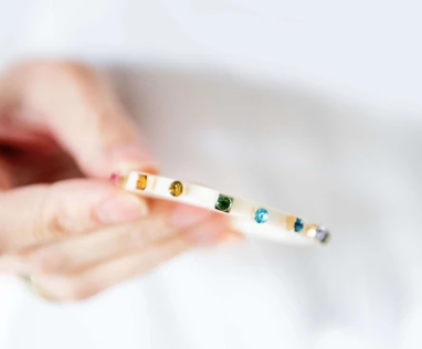 Ivory base with an assortment of rainbow jewels.  Acrylic thick hoop surged with a steel post, 1 1/4" SMALL OR 2 “ LARGE. Acrylic rhinestones extend the design for three dimensional look.Light weight, easy to put on and take off, comfortable to wear. Made of eco-friendly, lead-free, nickel-free, and not easy to corrosion.