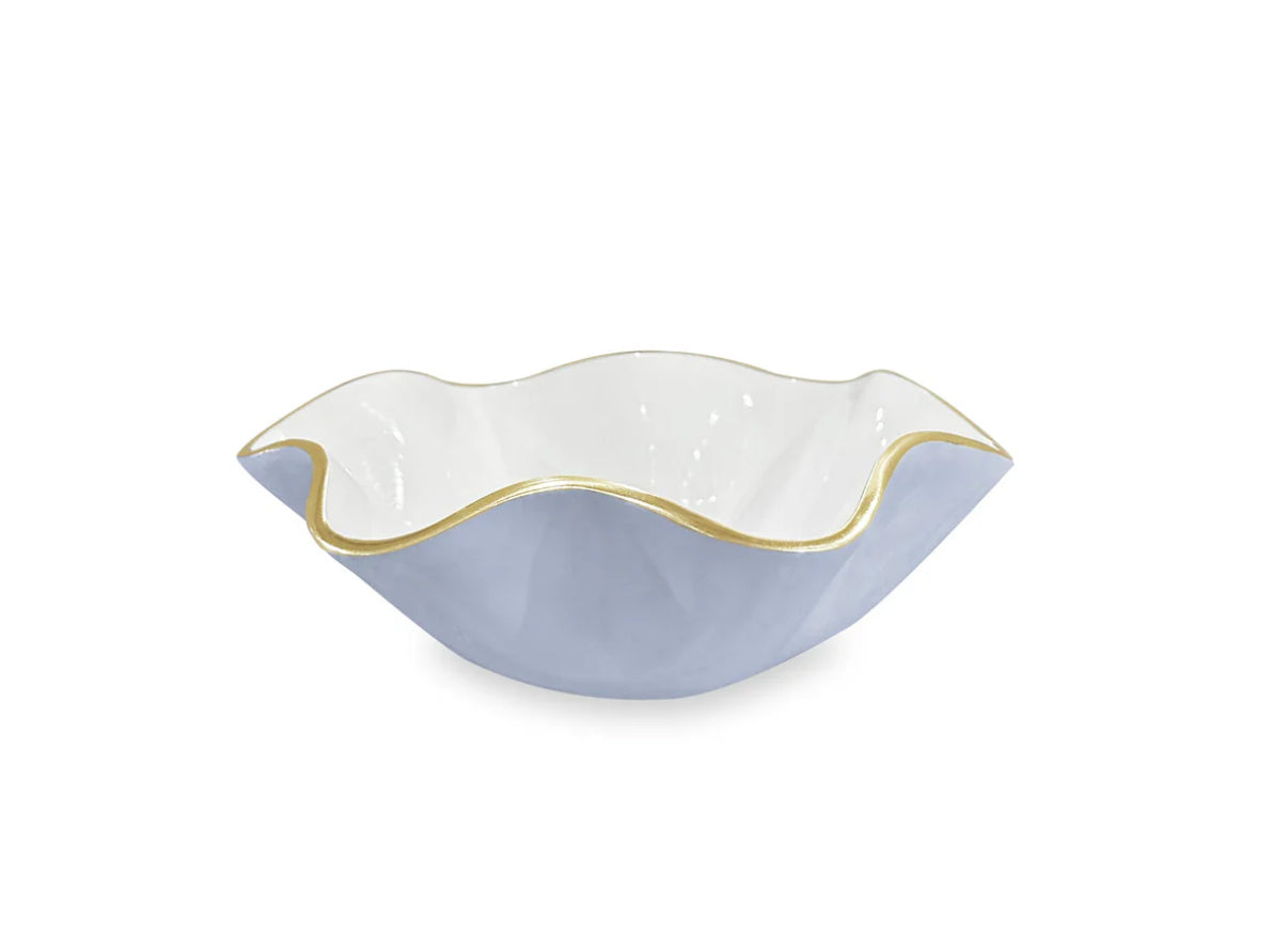 Distinctive for its flirty curves, fun shape, and brilliant two-tone finish rimmed in gold, the ENCANTO Carola Small Round Bowl (Periwinkle and White) is a small but fabulous design that is as practical as it is decorative. Ideal for snacks, it will find a home on the coffee table, the bar, or the kitchen island.