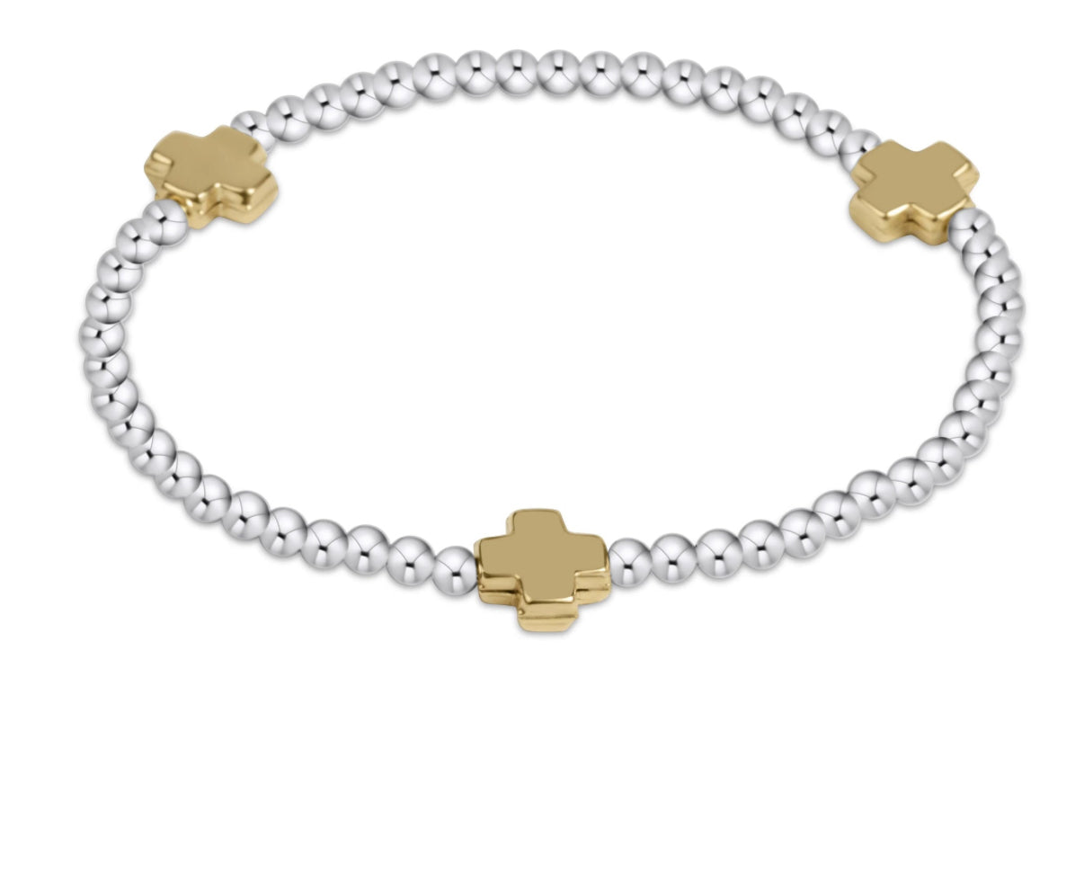 EXTENDS - SIGNATURE CROSS STERLING MIXED METAL PATTERN 3MM BEAD BRACELET - GOLD