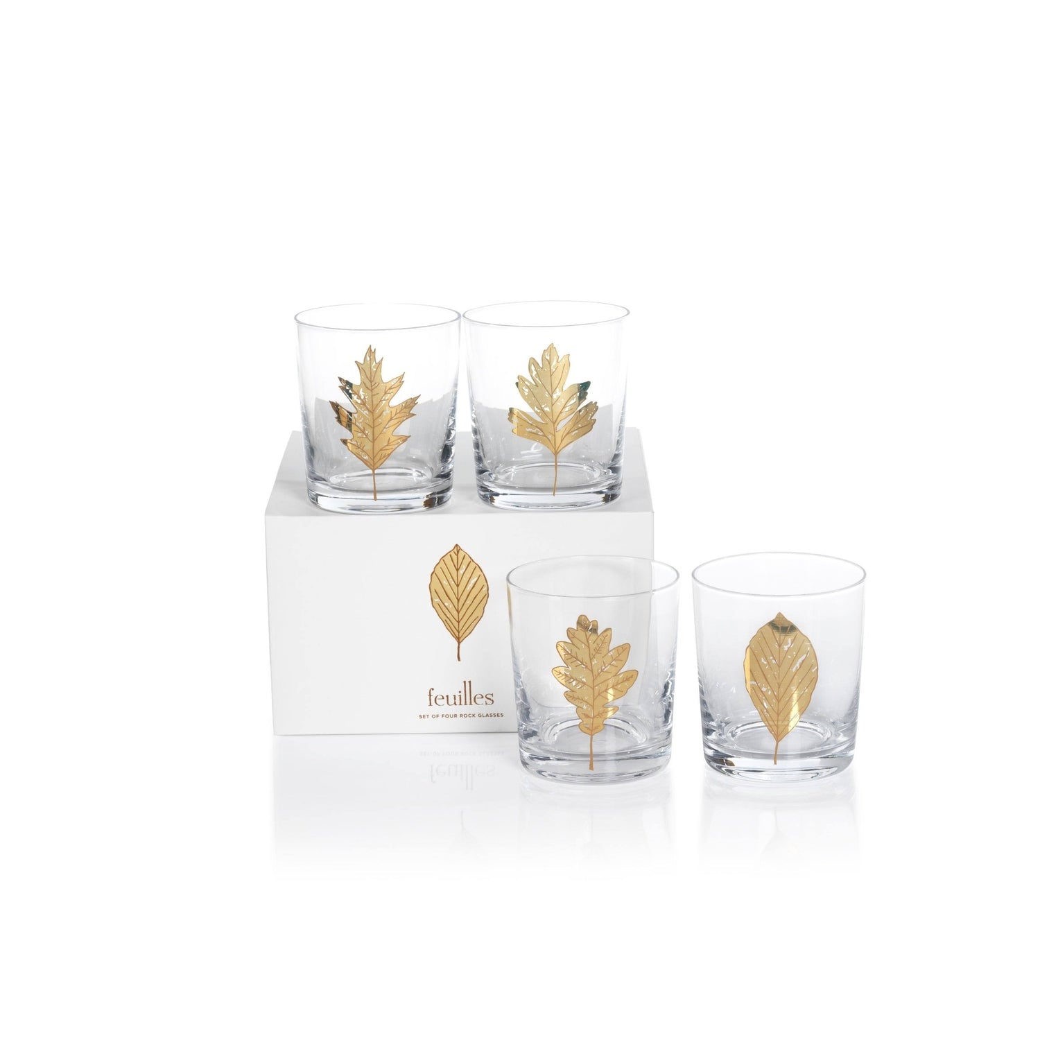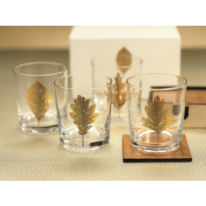 Gold leaves add modern elegance to this set of quality-crafted glasses. Wash by hand to keep them looking like new. Dimensions: 3.5 diam. x 4.5H in