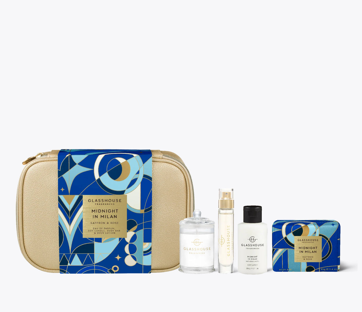 Contains Midnight In Milan: 1 x 0.47 fl. oz. Eau de Parfum, 1 x 2.1 oz. Candle, 1 x 1.7 fl. oz. Body Lotion & 1 x 3.4 oz. Body Bar all wrapped up in a Travel Cosmetic Case with packaging embellished with festive designs by Eirian Chapman.