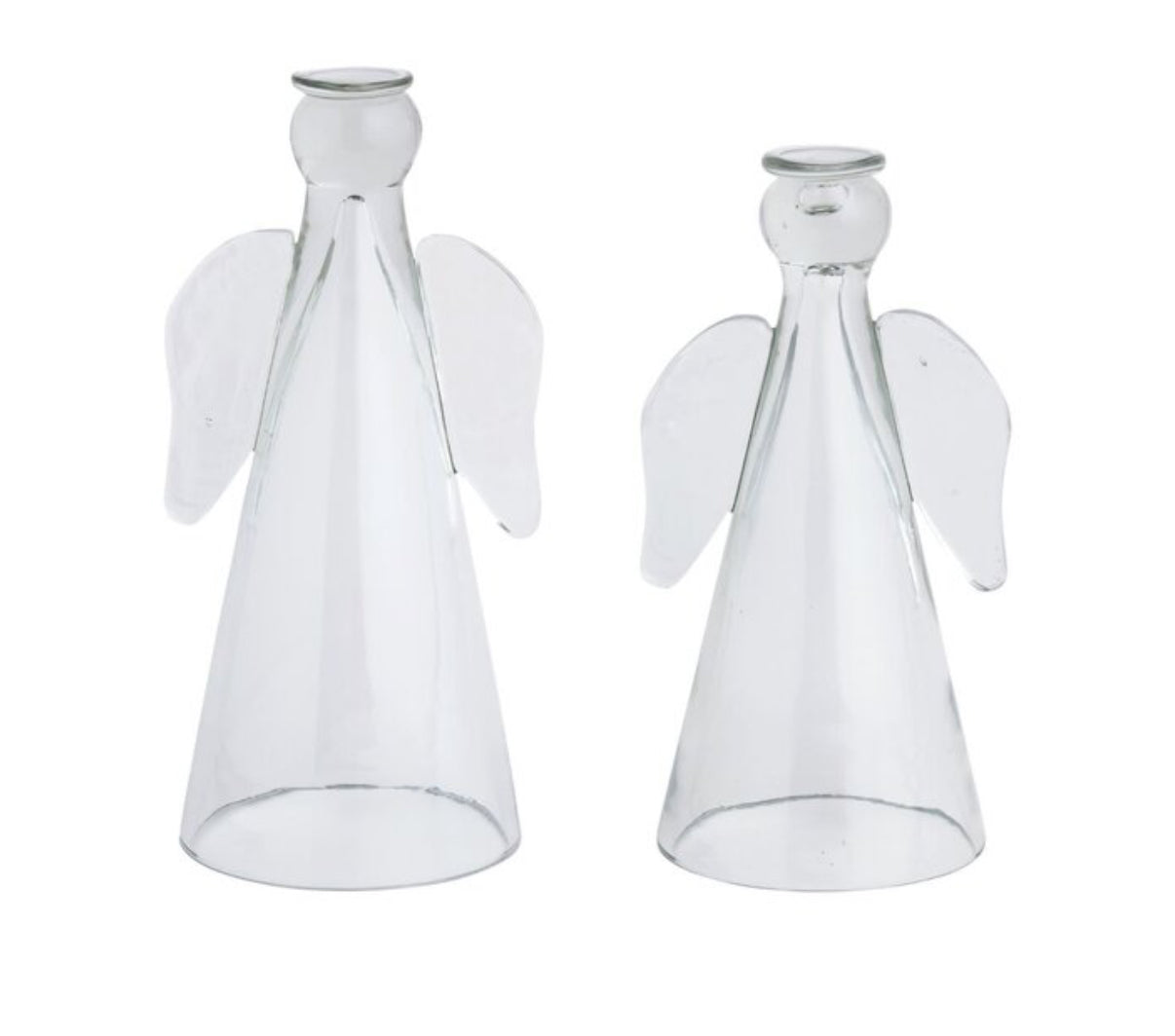 - Glass angel sitter with hollow base to cover flameless tea light. Tea light not included.