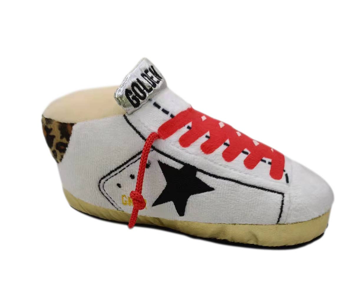 Get the distressed sneaker toy with soul! Our parody take on the iconic tennis shoe is not only jaw-dropping, itβs also drool-inducing! Just like the original, the plush white exterior is sure to become more authentic-looking with age. Unlike the original, this one features a delightful squeaker inside that will instantly make it a favorite with your furry fashionista!
