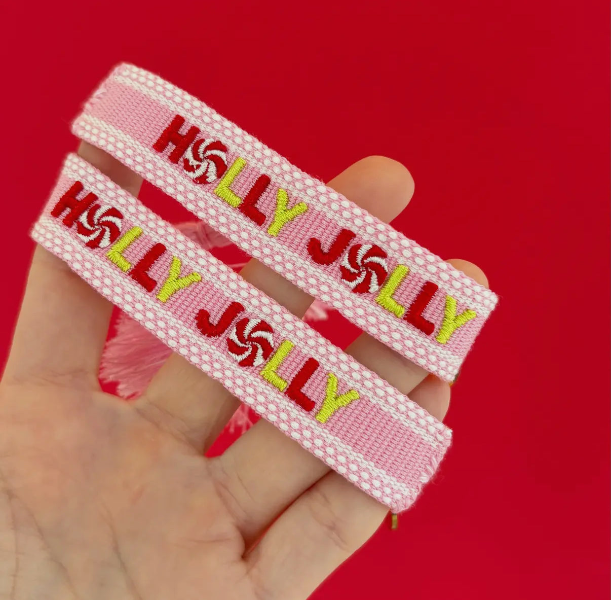 Pink embroidered tassel bracelet with "Holly Jolly" design