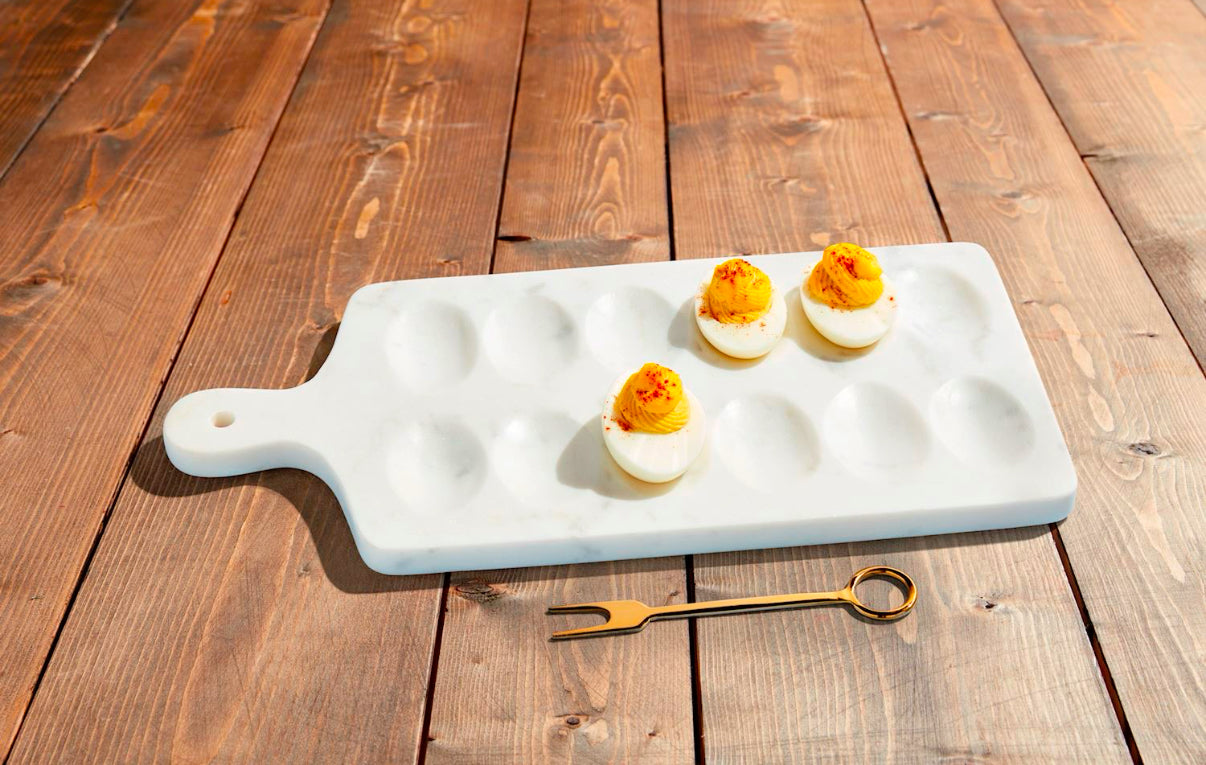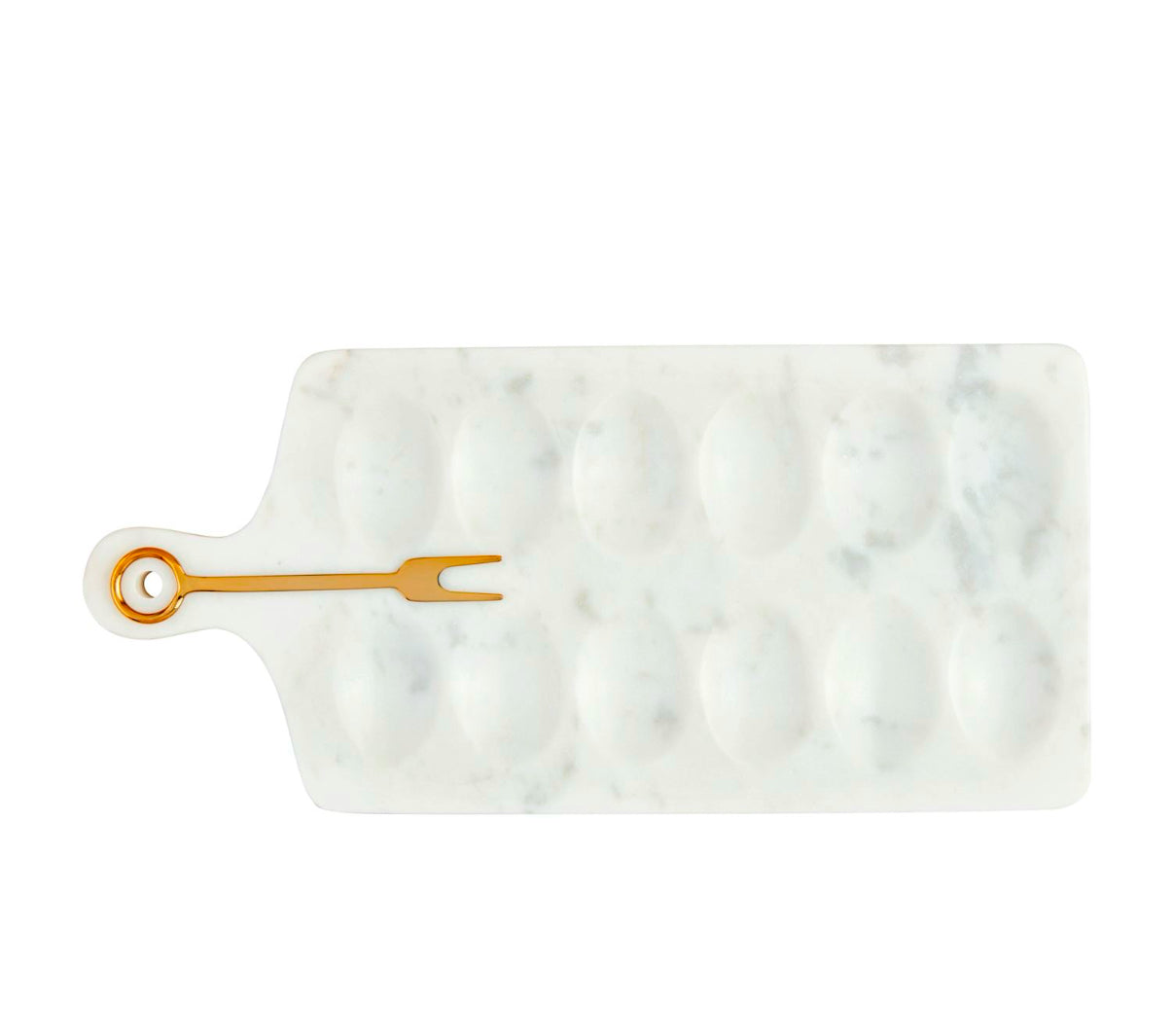 2-piece set. Marble deviled egg paddle board. Comes with brass finished stainless steel fork.