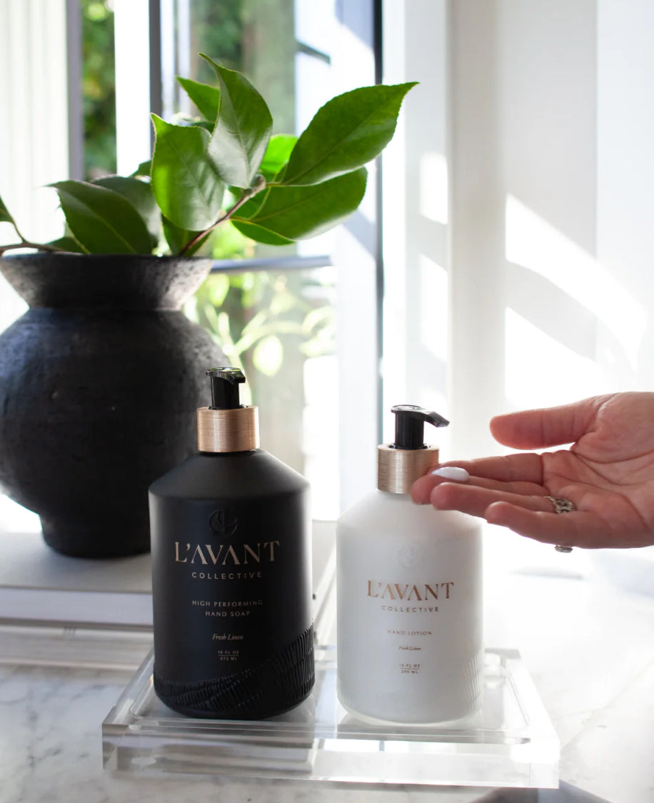 Our premium-quality Medium Lucite Tray is a luxurious addition to any room. Crafted with luxury acrylic and custom L'AVANT Collective etched logo, it fits two of our L'AVANT pieces and can be placed on a sink, vanity or side table, adding a sophisticated touch with its sink-side style.