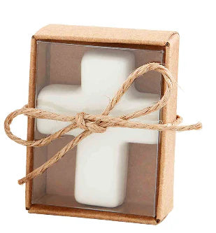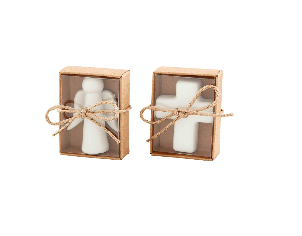 Mottled ceramic pocket size cross or angel. A little reassurance to take in a purse, car or keep on a nightstand. Each comes in kraft box inside glass display jar.