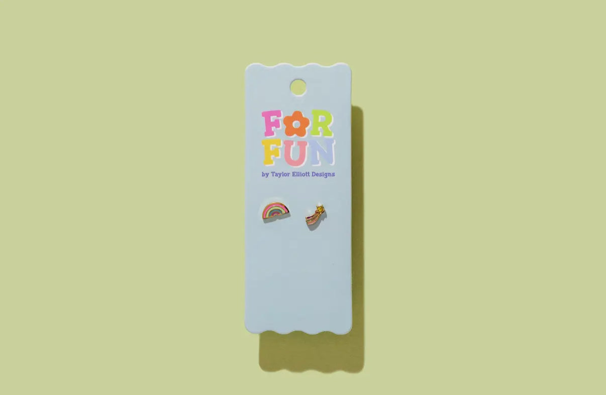 Brighten up any tween's day with these playful Sarah Star and Rainbow Stud Earrings. Featuring colorful enamel, this fun duo adds a cheerful touch to any outfit. Each pair is complete with one shooting star stud and one rainbow stud!