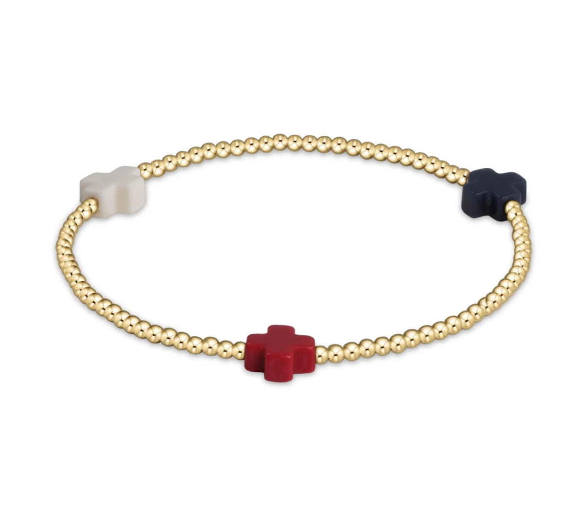 - Made with 2mm, 14kt gold-filled beads and signature crosses in red, off-white, and navy