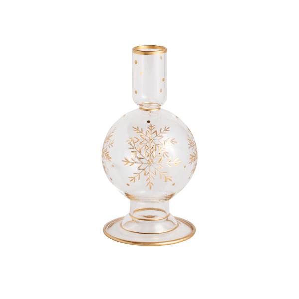 Elevate your holiday décor with this exquisite Snowflake Taper Holder, a stunning piece that combines elegance and festive charm. Crafted from high-quality glass, this taper holder showcases intricate snowflake etching that captures the essence of winter's beauty. The delicate gold foil detailing adds a touch of luxury, making it a perfect centerpiece for any seasonal gathering. It is designed to hold standard taper candles, casting a warm and inviting glow. Whether adorning your dining table, mantel, or entryway, this glass bauble taper holder is sure to impress guests and enhance your holiday ambiance. Ideal for both contemporary and traditional settings, it also makes a thoughtful gift for loved ones who appreciate fine craftsmanship and festive elegance.