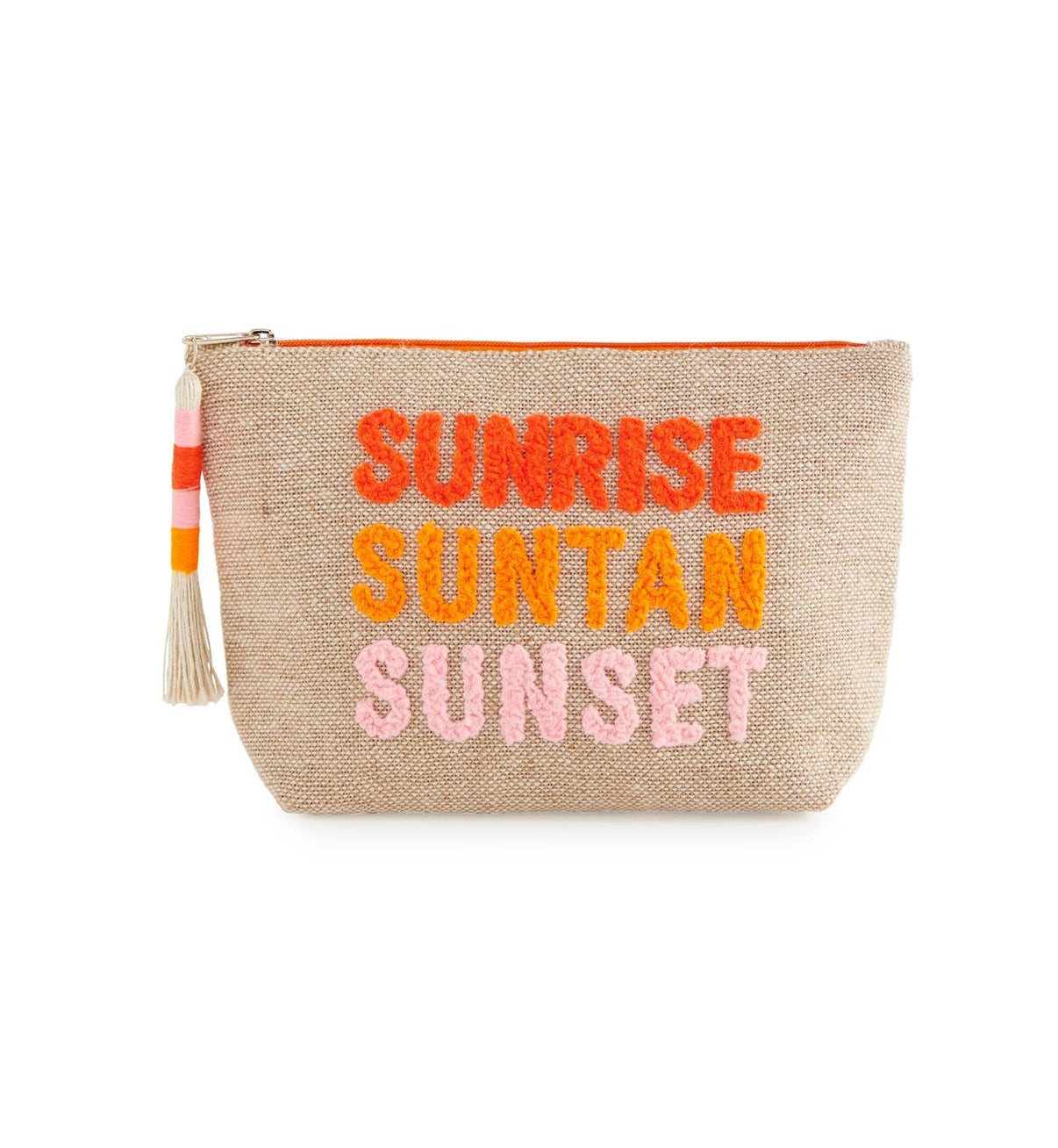 The "Sunrise Suntan Sunset" Zip Pouch is your ultimate beach companion, blending charm and utility. Crafted from natural jute fabric, it features vibrant tufted embroidery in playful hues that perfectly capture your summer vibe. With a spacious interior and a colorful tassel zipper, it's ideal for storing all your sunny-day essentialsāfrom sunscreen to shades. Compact and effortlessly stylish, this pouch brings a touch of fun to every sun-soaked adventure.