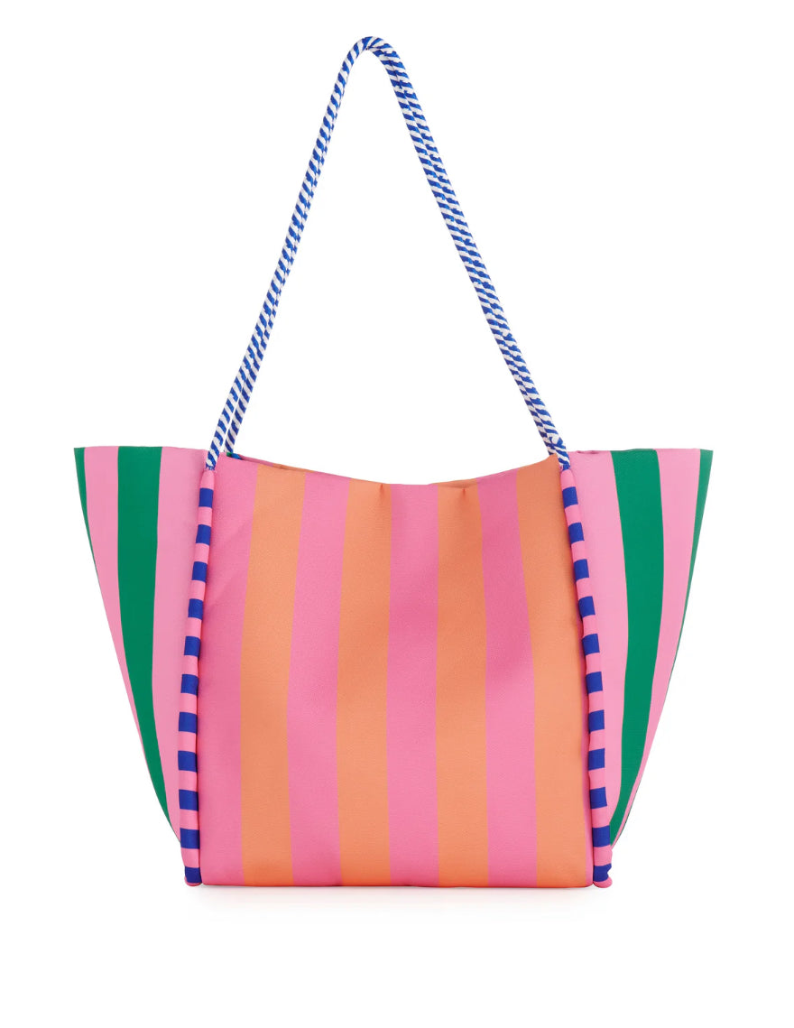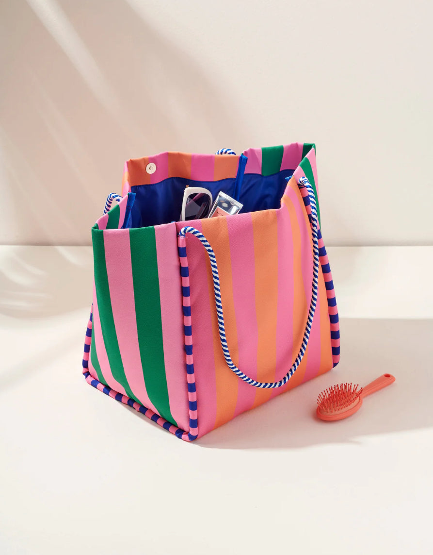 The Taormina Tote is your new go-to for beach days and summer adventures! Featuring bold, vibrant stripes in playful shades of pink, orange, green, and blue, this roomy tote packs a punch in both style and function. Its cord shoulder straps add a trendy twist, while the spacious interior ensures you can stash all your essentials with ease.