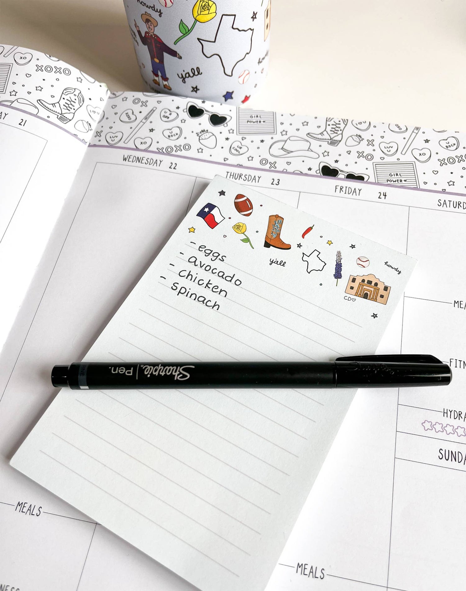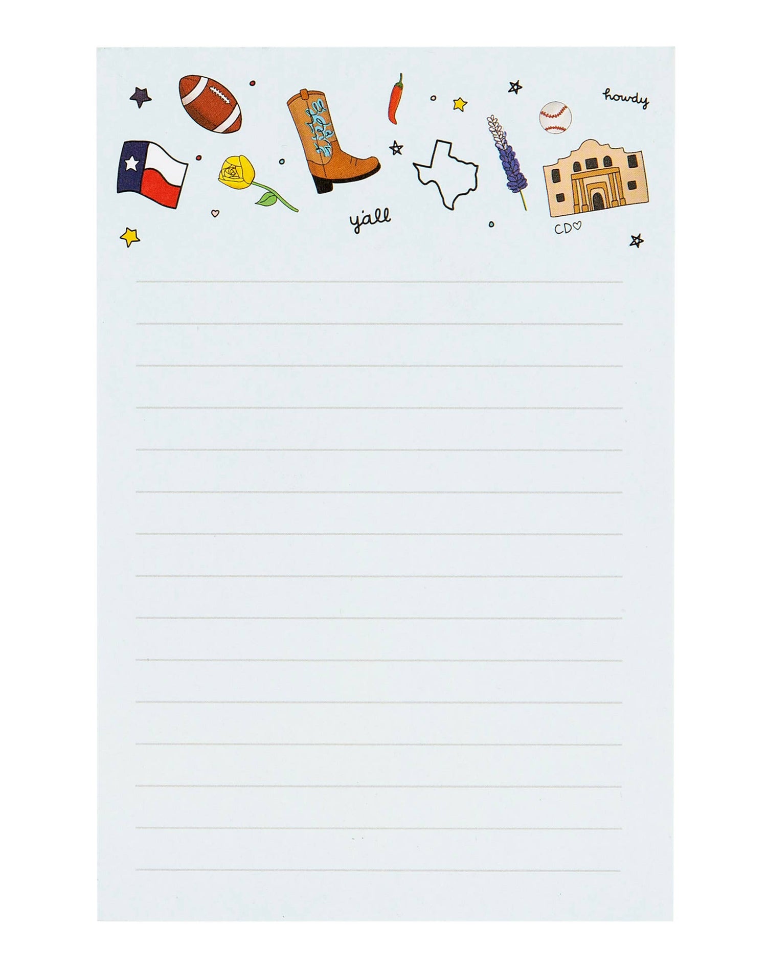 Always have a place to make lists and jot down notes! This light blue, lined, Texas-themed notepad features iconic Western doodles like the Alamo, cowboy boots, the TX state flag, and bluebonnets that represent the Lonestar State. With 52 lined sheets, this notepad is perfect for grocery lists, meal planning, brainstorming, to-do lists, or even weekly planning!