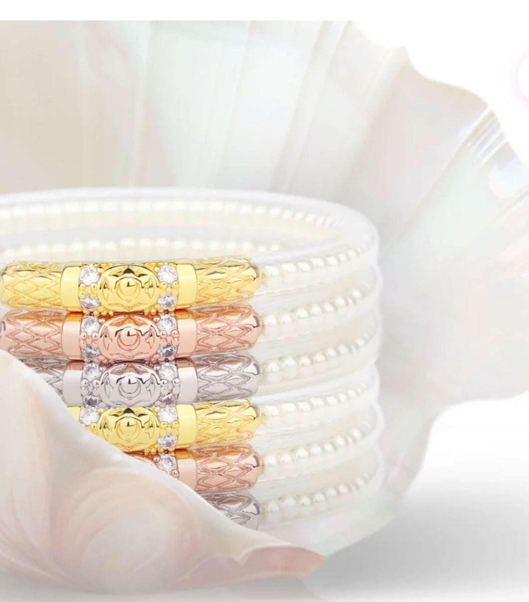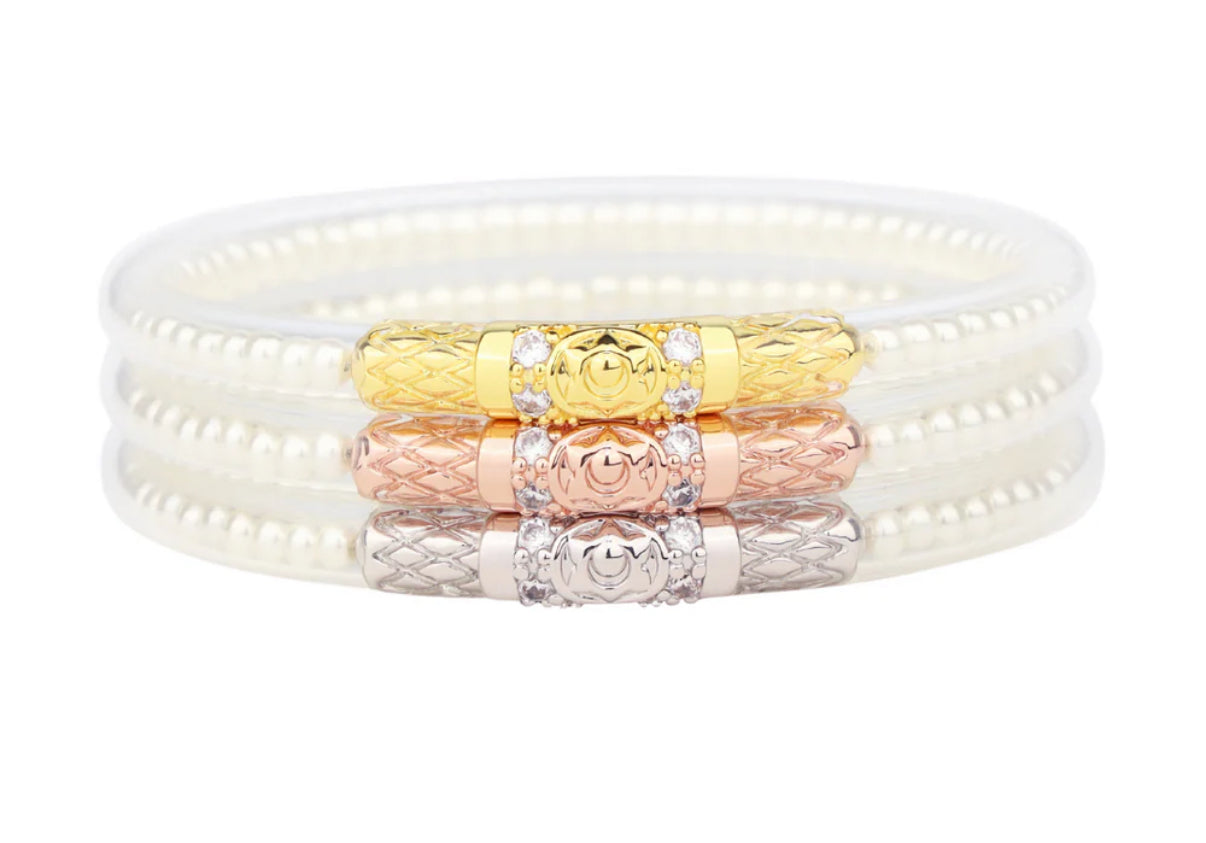 Celebrate remarkable moms with BuDhaGirl's White Pearl Bangles. Delicate pearls encased in flexible tubing are accented with our symbolic Lotus bead in three gold tones. Handcrafted in Thailand, this elegant set captures the essence of femininity and grace.