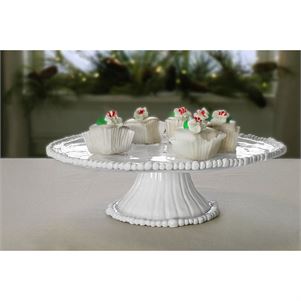 The versatile and cleverly designed white cake stand boasts a twist-off pedestal for easy storage. Inverted, the base doubles as a dip bowl when placed atop the round platter. The eye-catching and generously proportioned cake stand has the luster, heft and look of a ceramic piece. Made of luxury melamine for everyday enjoyment, this piece is ideally suited for indoor and outdoor entertainment. Pairs well with items from Beatriz Ball's signature metal line, too. Dishwasher safe (top rack), heavy-weight, break resistant and durable, food safe, BPA and PABA free.