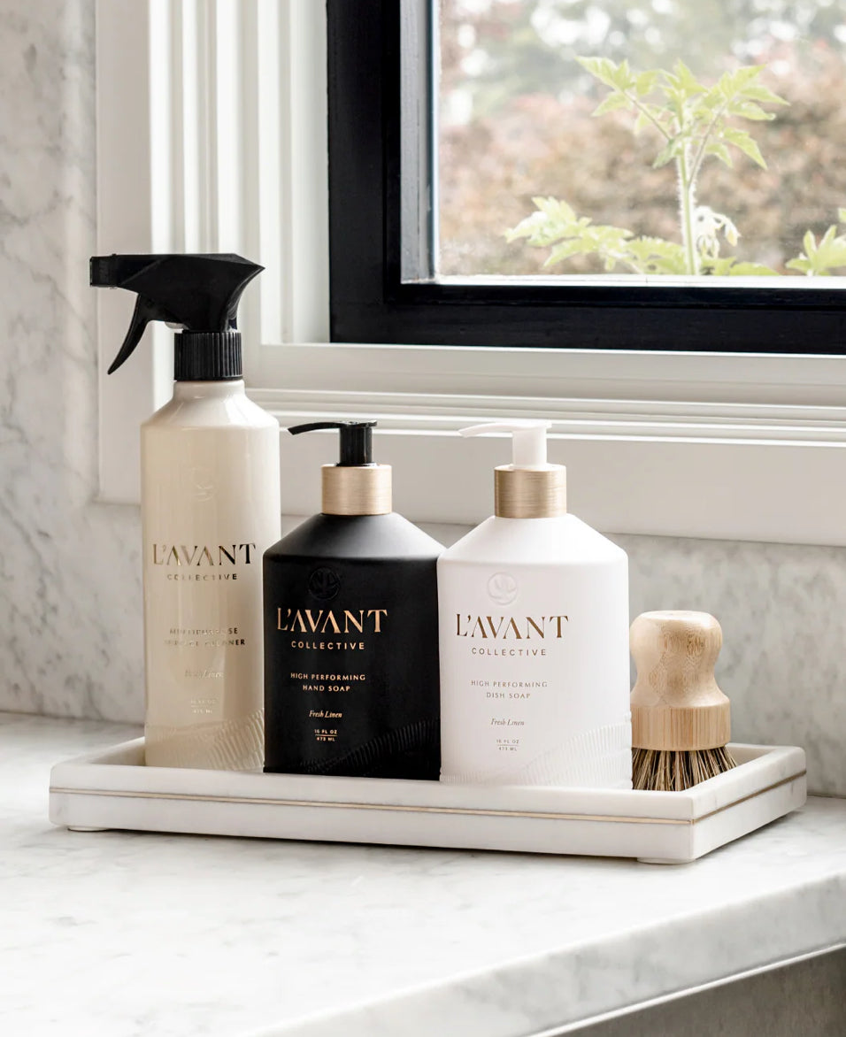 Made from the finest white marble, brass accent details, and quarried in India. Known for its durability and natural shine, this high-end stone contains subtle grey veining that makes each tray one-of-a-kind. Brass inlay detailing reflects the look of our L’AVANT bottles, and the discreet addition of the L’AVANT logo in the corner completes the custom design.