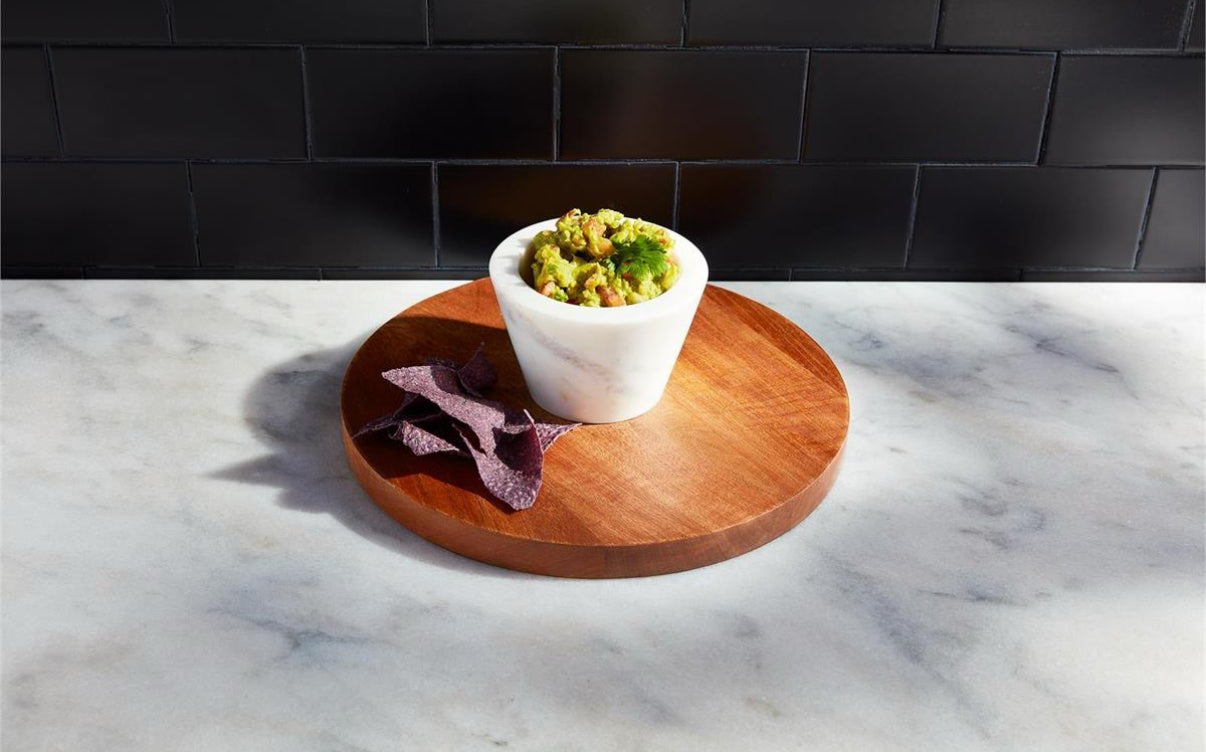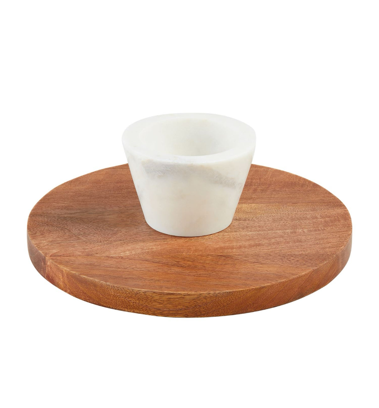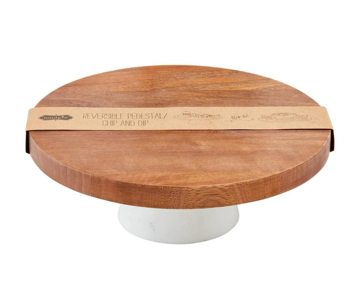 Mango wood and marble server goes from pedestal stand to chip & dip just by flipping it over.